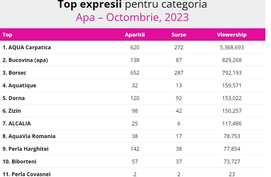 Aqua Carpatican este lider în topul celor mai vizibile branduri de apă în online la categoria “Top expresii” pentru luna octombrie, informează iqads.ro. Topul lunar...